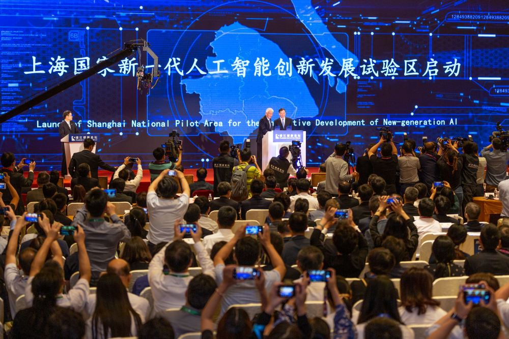 在上海舉行的2019浦江創新論壇全體大會上,科技部與上海市政府共同啟動上海國家新一代人工智能創新發展試驗區建設(2019年5月25日攝)。