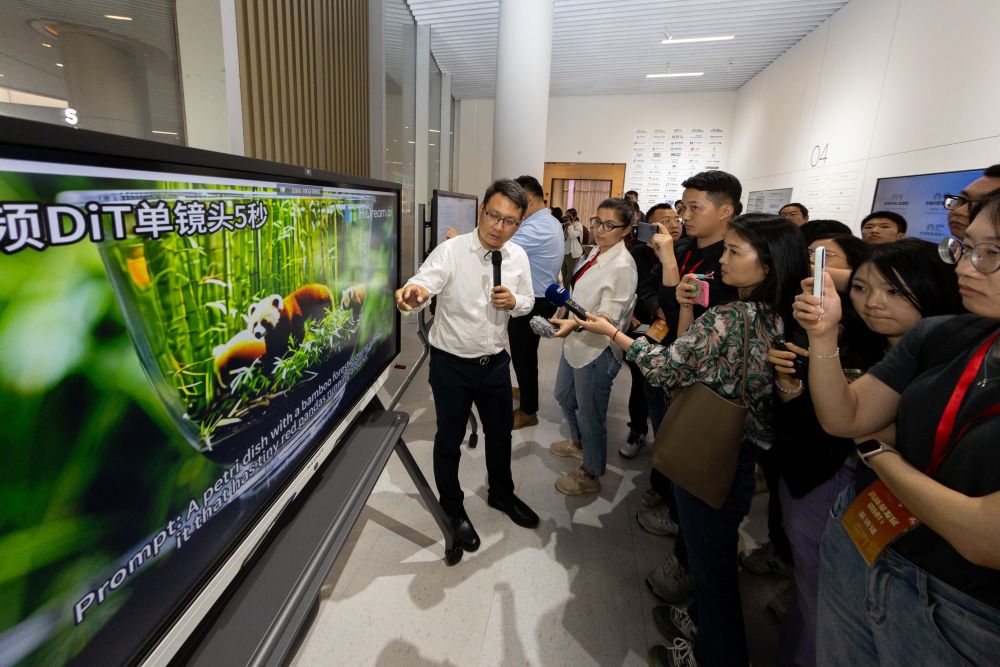 2024年5月23日,在「模速空間」,工作人員為採訪團介紹運用大模型文生視頻。