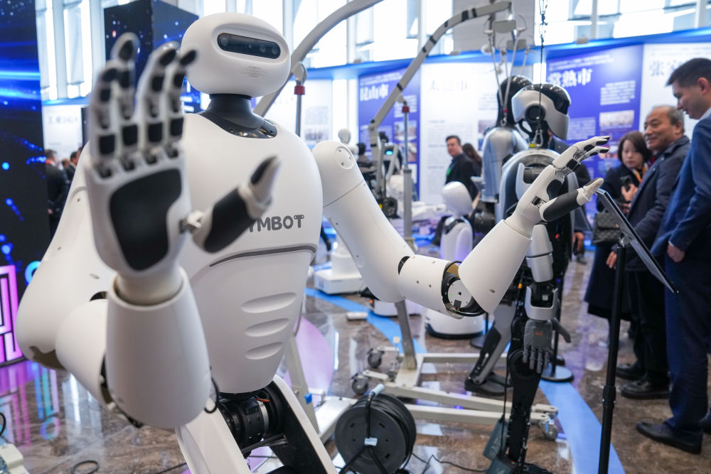 2025年2月14日,在2025年蘇州市「人工智能+」創新發展推進大會暨人工智能賦能新型工業化深度行(蘇州站)活動現場拍攝的人形機器人。