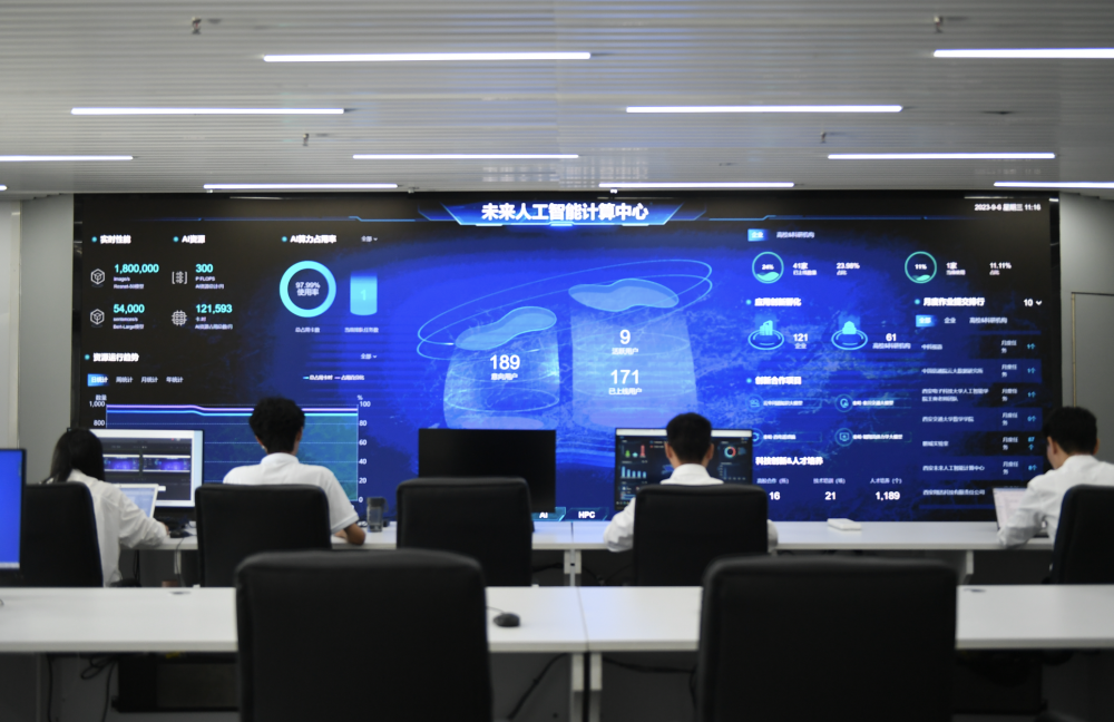 2023年9月6日,在陜西西安的未來人工智能計算中心監控運維室,工作人員通過智慧大屏監測平台運行情況。