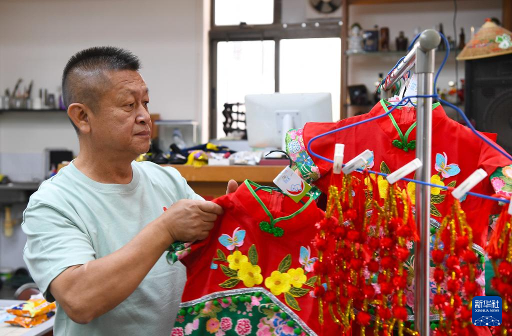 4月30日,飄色師傅李智偉在整理小演員的服飾。新華社發