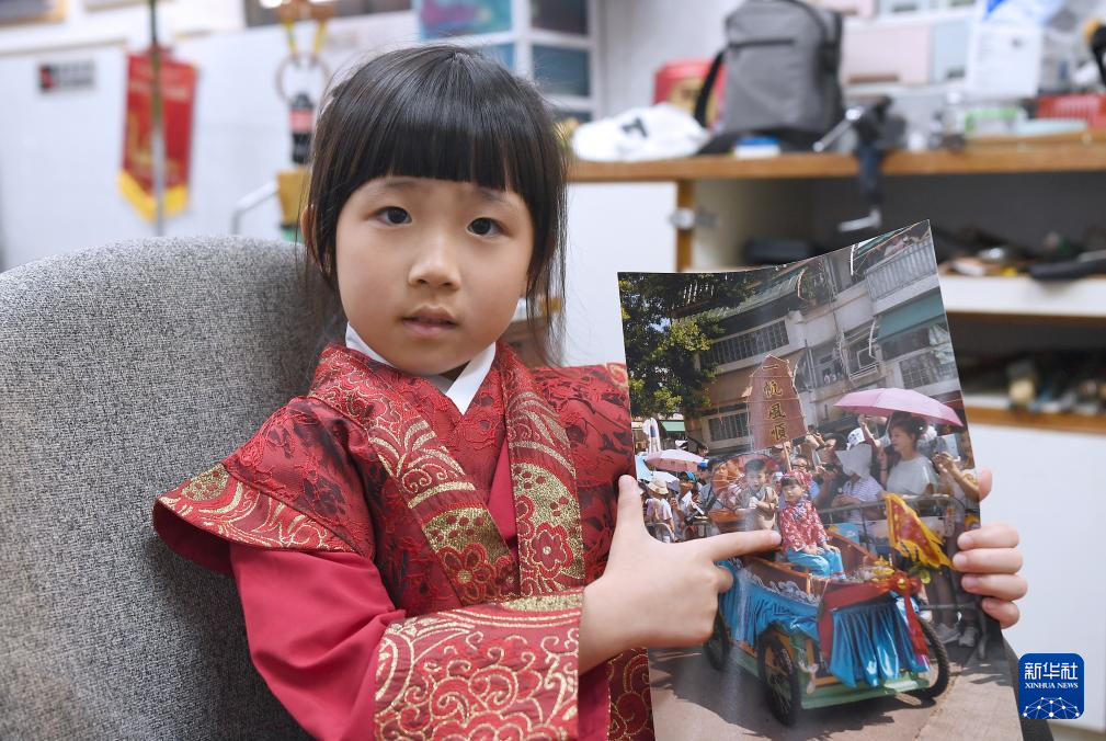 4月30日,徐心妤展示自己去年參加「飄色會景巡游」的照片。新華社記者 陳鐸 攝