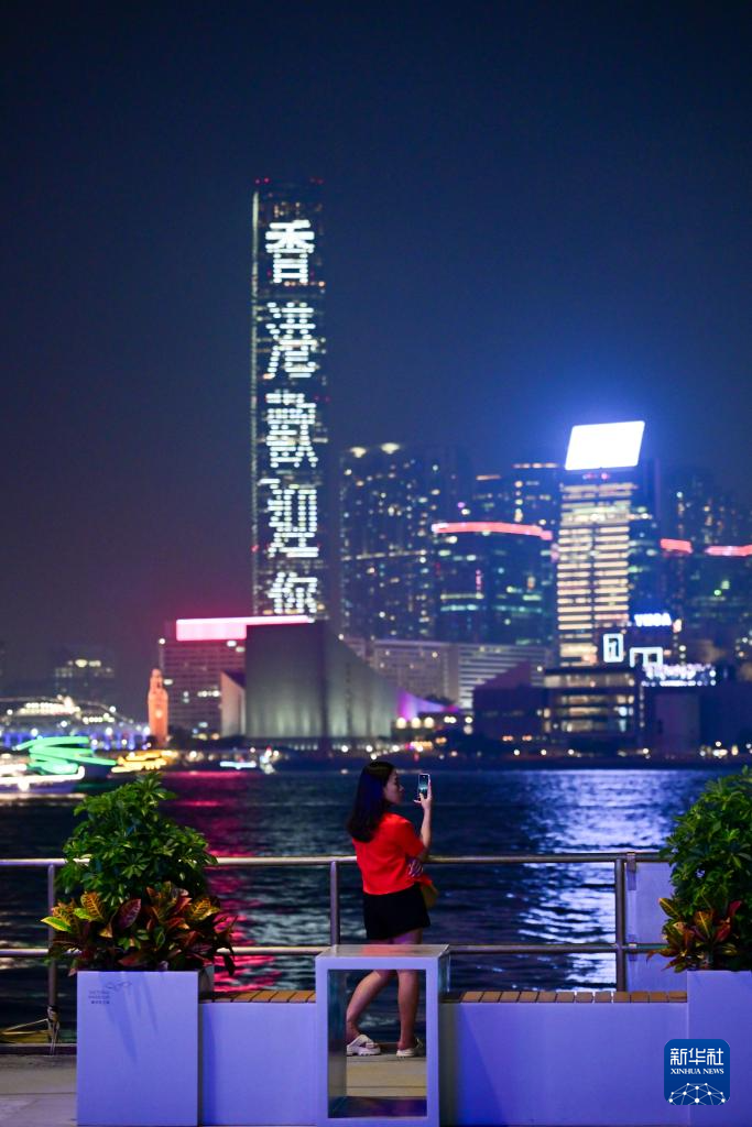 5月2日,一名女士在拍攝香港維多利亞港夜景。新華社記者 朱煒 攝