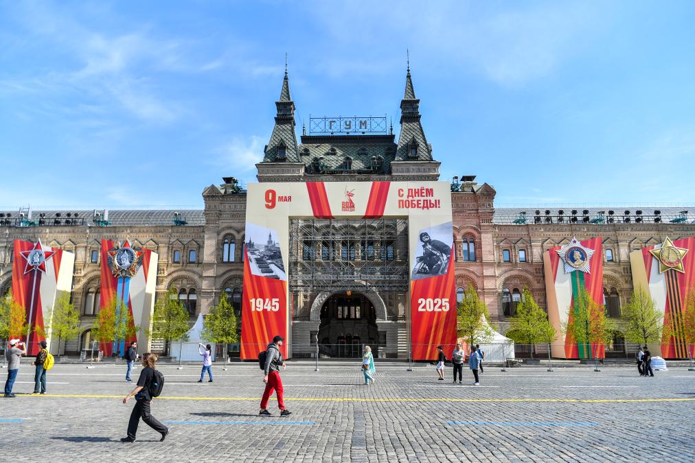 紀念蘇聯偉大衛國戰爭勝利80周年慶典前夕,莫斯科街頭,寫有「勝利」字樣的旗幟隨風飄揚。在路邊,以蘇聯衛國戰爭歷史為主題的圖片展板和裝飾櫥窗吸引行人停下腳步,或合影留念,或瀏覽沉思。