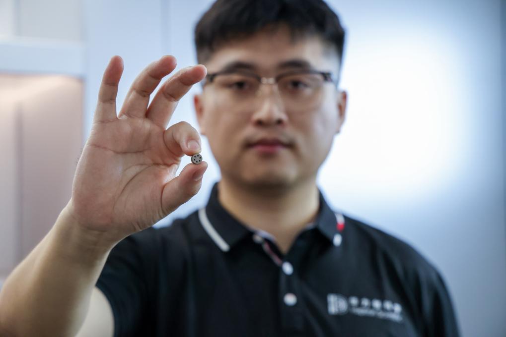 4月24日,在位於河套深港科技創新合作區內的香港科學園深圳分園,華力創科學聯合創始人魚晨展示直徑僅8.5毫米的微傳感器。新華社記者 梁旭 攝