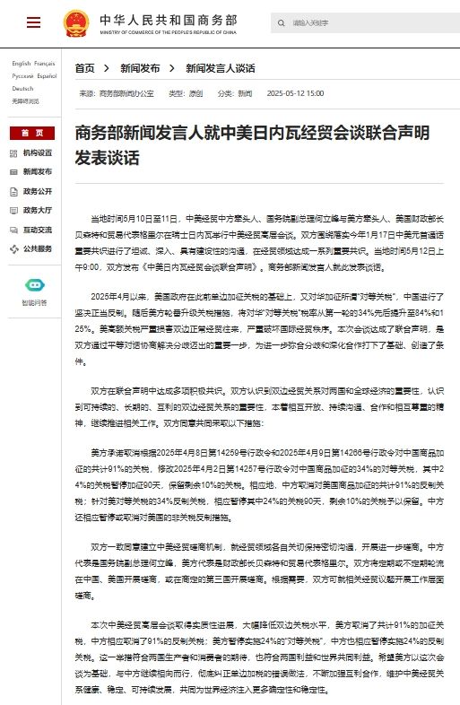 當地時間5月10日至11日,中美經貿中方牽頭人、國務院副總理何立峰與美方牽頭人、美國財政部長貝森特和貿易代表格裏爾在瑞士日內瓦舉行中美經貿高層會談。雙方圍繞落實今年1月17日中美元首通話重要共識進行了坦誠、深入、具有建設性的溝通,在經貿領域達成一系列重要共識。當地時間5月12日上午9:00,雙方發布《中美日內瓦經貿會談聯合聲明》。商務部新聞發言人就此發表談話。