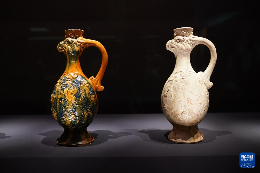 繼續前行,便來到「跨越文化——胡食風尚」單元。故宮博物院藏唐代鳳首壺與舊金山亞洲藝術博物館藏鳳首壺「並肩而立」,它們獨特的把手與流口設計,仿佛訴説着胡人傾注式倒酒習俗對中原的影響。