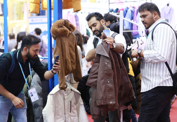 2025年5月1日,在廣州開幕的第137屆廣交會第三期上,境外採購商在一家服裝企業的展區拍攝樣品。新華社記者 王瑞平 攝