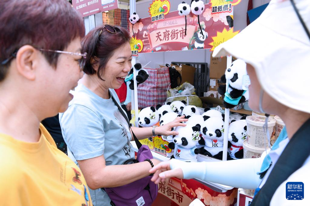 6月1日,市民在第三屆「家鄉市集嘉年華」香港四川社團總會的攤位上選購熊貓玩偶。新華社記者 陳鐸 攝