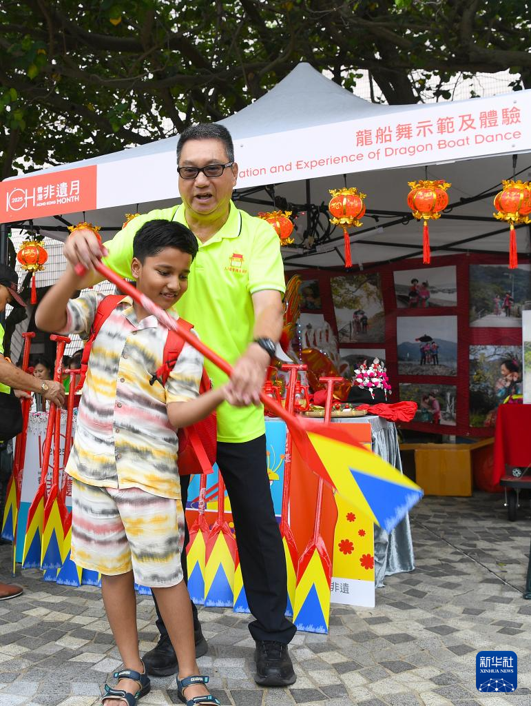 5月31日,一名男孩在香港文化中心露天廣場舉行的「非遺嘉年華」上體驗龍船舞。新華社記者 陳鐸 攝