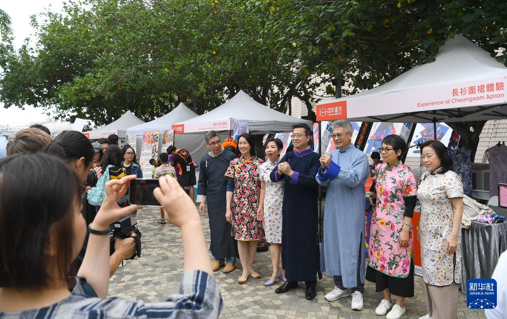 5月31日,在香港文化中心露天廣場舉行的「非遺嘉年華」上,人們身着旗袍長衫合影。新華社記者 陳鐸 攝