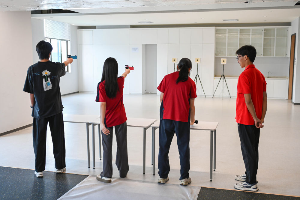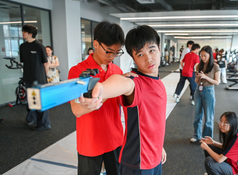↑圖為學生們在廣州市中黃港澳子弟學校運動室進行射擊訓練(6月19日攝)。新華社記者 肖恩楠 攝