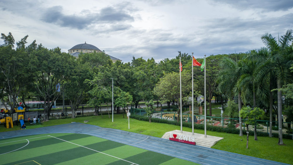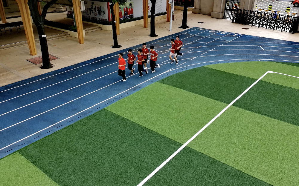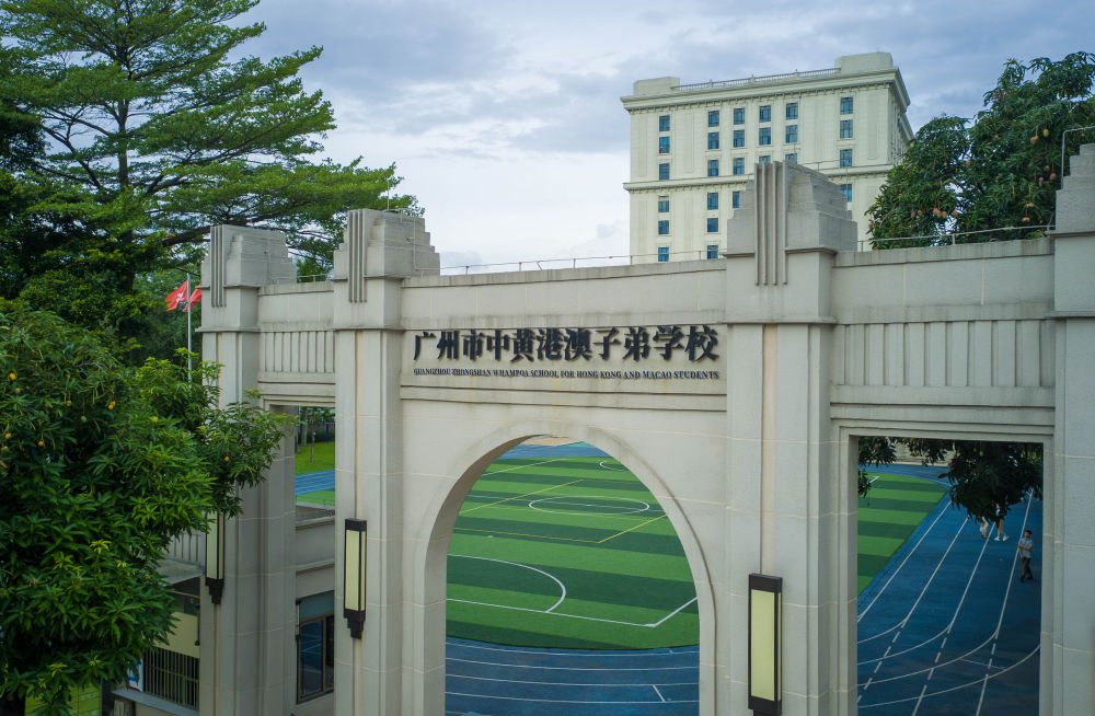 ↑圖為6月19日拍攝的廣州市中黃港澳子弟學校操場(無人機照片)。新華社記者肖恩楠攝