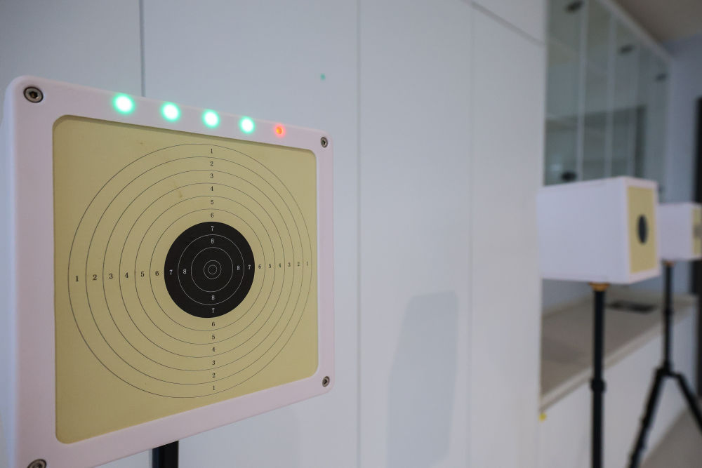 ↑圖為在廣州市中黃港澳子弟學校運動室,激光射擊的電子靶顯示出中靶信息(6月19日攝)。新華社記者 劉大偉 攝