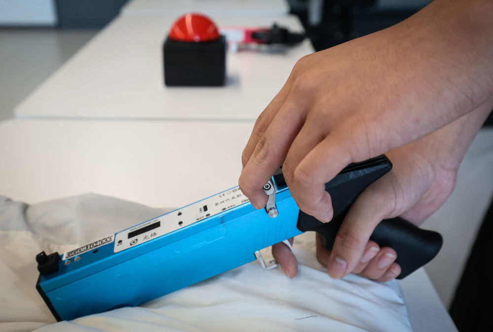 ↑圖為廣州市中黃港澳子弟學校港籍生湯恩梁進行激光射擊訓練(6月19日攝)。新華社記者 劉大偉 攝