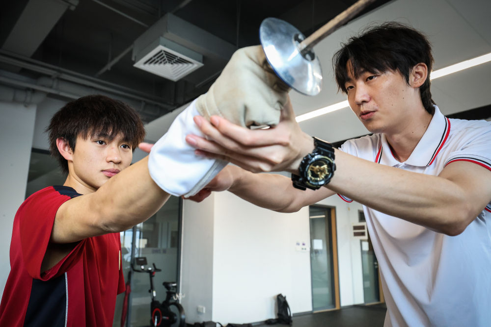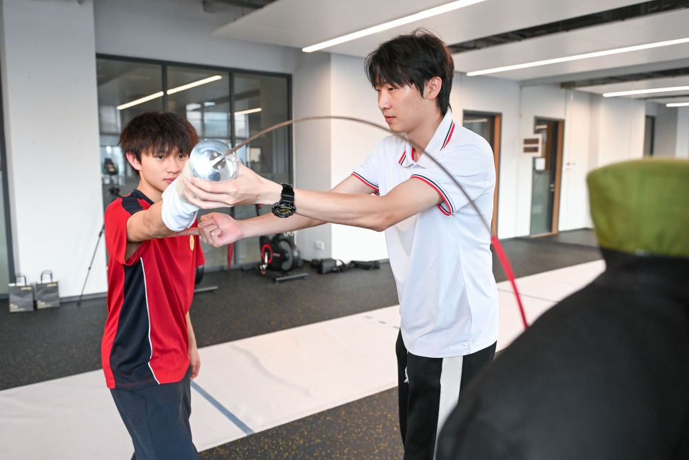 ↑圖為廣東現代五項運動協會教練員肖勇炫(右)糾正廣州市中黃港澳子弟學校港籍生張嗣濤擊劍技術細節(6月19日攝)。新華社記者肖恩楠攝