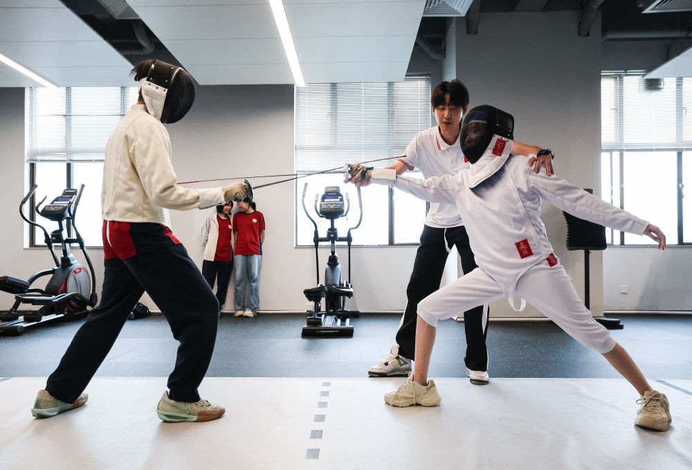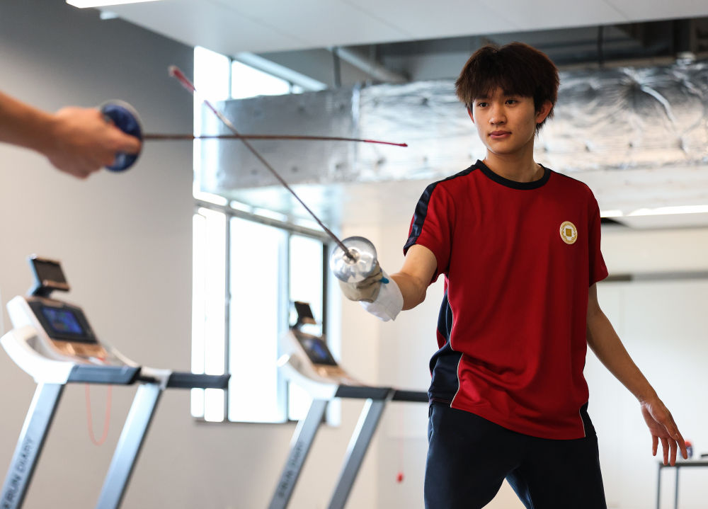 ↑圖為廣州市中黃港澳子弟學校港籍學生張嗣濤進行擊劍訓練(6月19日攝)。新華社記者劉大偉攝