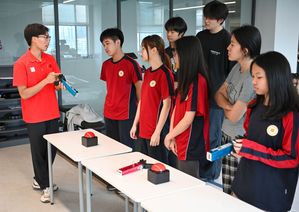 ↑圖為廣東現代五項運動協會教練員滕澤華(左一)為廣州市中黃港澳子弟學校學生講解射擊注意事項(6月19日攝)。新華社記者 肖恩楠 攝