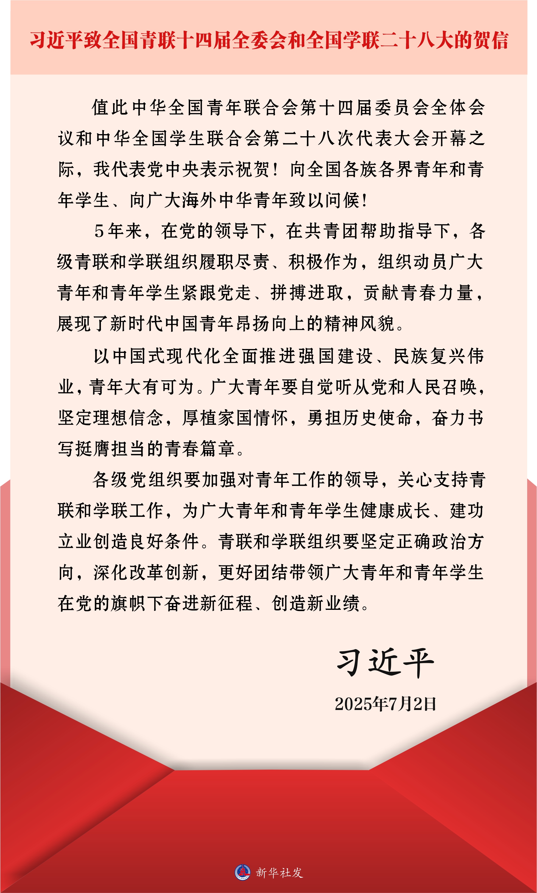 中華全國青年聯合會第十四屆委員會全體會議、中華全國學生聯合會第二十八次代表大會2日上午在京開幕。中共中央總書記、國家主席、中央軍委主席習近平發來賀信,代表黨中央表示祝賀,向全國各族各界青年和青年學生、向廣大海外中華青年致以問候。