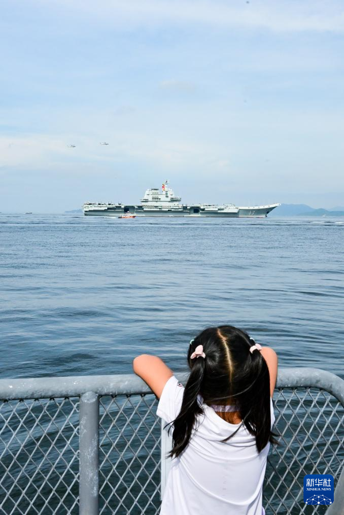 7月3日,一名兒童在岸上觀看海軍山東艦抵達香港。新華社記者 朱煒 攝