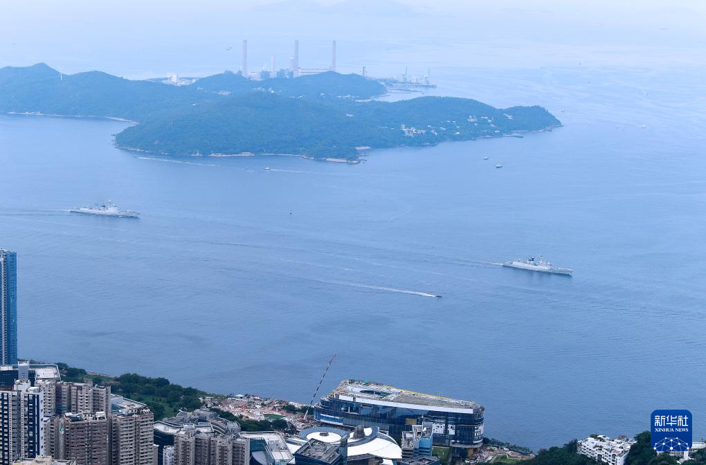 7月3日,海軍運城艦(右)和湛江艦行進在香港水域。新華社記者 陳鐸 攝