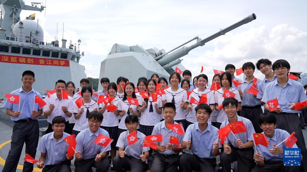 7月3日,中國海軍山東艦航母編隊抵達香港。這是香港中學生登上海軍運城艦參觀、留影。新華社發(段振軍 攝)