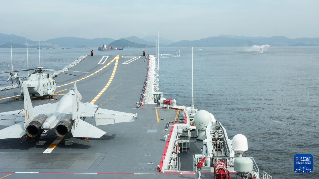 下午5時,李家超和特區政府各部門官員,中央港澳辦、中央駐港駐澳機構、南部戰區、駐香港部隊、駐澳門部隊代表登上山東艦。山東艦值更士兵吹響海軍笛。寬敞的飛行甲板上,12架殲-15艦載戰鬥機和直-18、直-9艦載直升機排列整齊。接下來的幾天,香港市民有機會登上山東艦,與這些國産艦載戰鬥機、直升機合影打卡,還可以在機庫中親手觸摸系列現役輕武器。