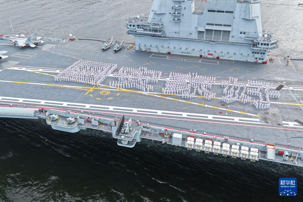 7月3日,中國海軍山東艦航母編隊抵達香港。這是山東艦官兵在飛行甲板上列隊排出「國安家好」字樣(無人機照片)。新華社發(蒲海洋 攝)