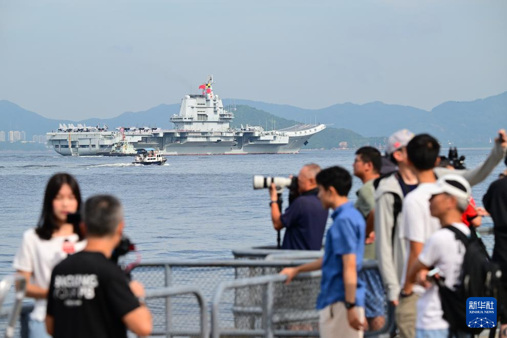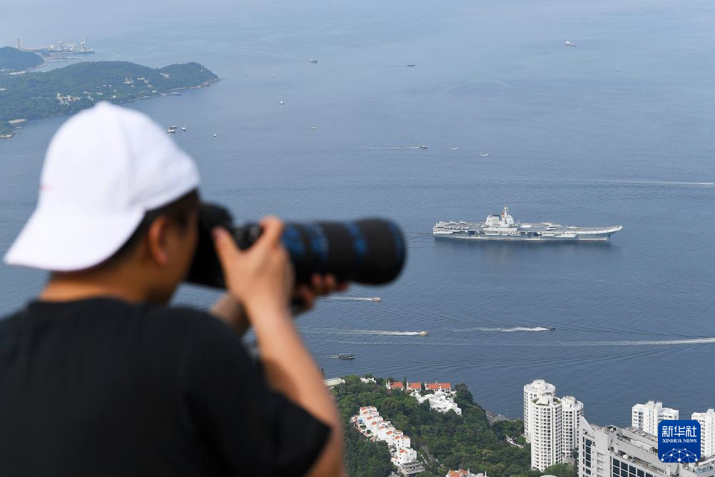 7月3日,人們在岸上拍攝海軍山東艦抵達香港。新華社記者 朱煒 攝