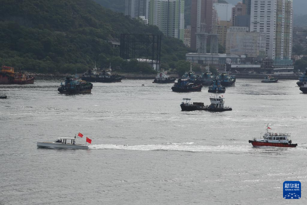 7月3日,中國海軍山東艦航母編隊抵達香港。這是民眾駕駛民船隨艦航行迎接航母編隊。新華社發(潘小員 攝)