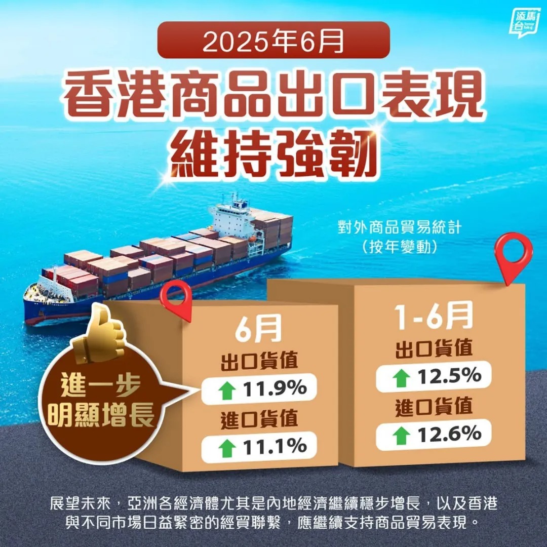 數據顯示,6月香港整體出口貨值4178億港元,較去年同月上升11.9%。當月,香港輸往亞洲的整體出口貨值上升17.2%。此地區內,輸往大部分主要目的地的整體出口貨值錄得升幅,包括馬來西亞升52.6%、菲律賓升48.3%、越南升37.6%、中國內地升18.3%和印度升12.5%。另一方面,輸往韓國的整體出口貨值則錄得跌幅(跌10.9%)。