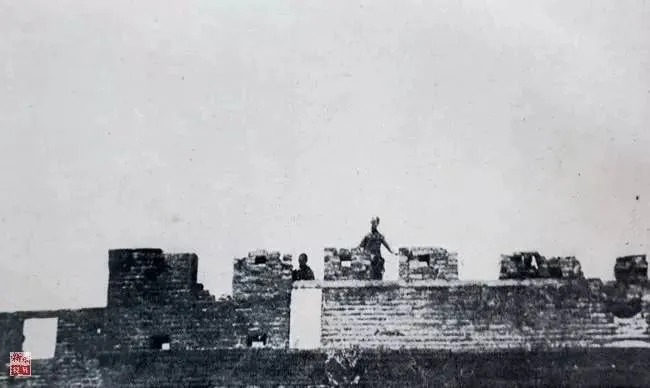 在七七事變發生後拍攝的第29軍將士在宛平縣城上監視日軍的照片。照片上可見城墻上彈痕纍纍,殘破不全,顯示宛平城剛剛遭受過日軍十分猛烈的炮擊。新華社發