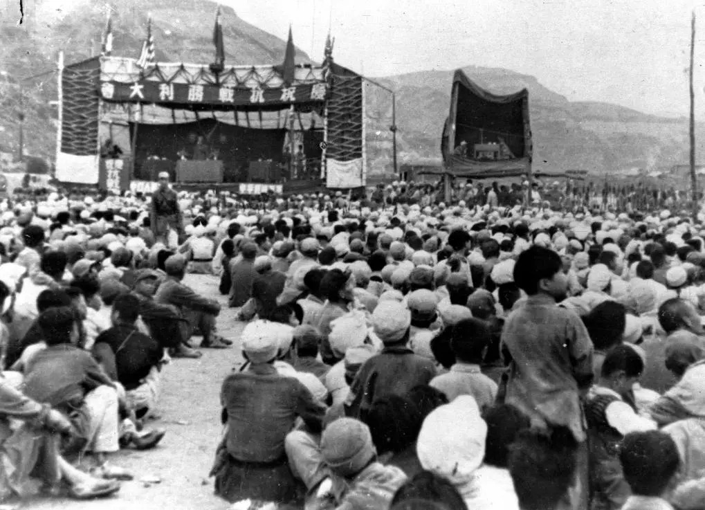 延安軍民集會慶祝抗戰勝利(資料照片)。新華社發