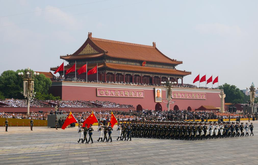 9月3日,紀念中國人民抗日戰爭暨世界反法西斯戰爭勝利80周年大會在北京隆重舉行。這是國旗護衛隊在行進中。新華社記者 魏培全 攝