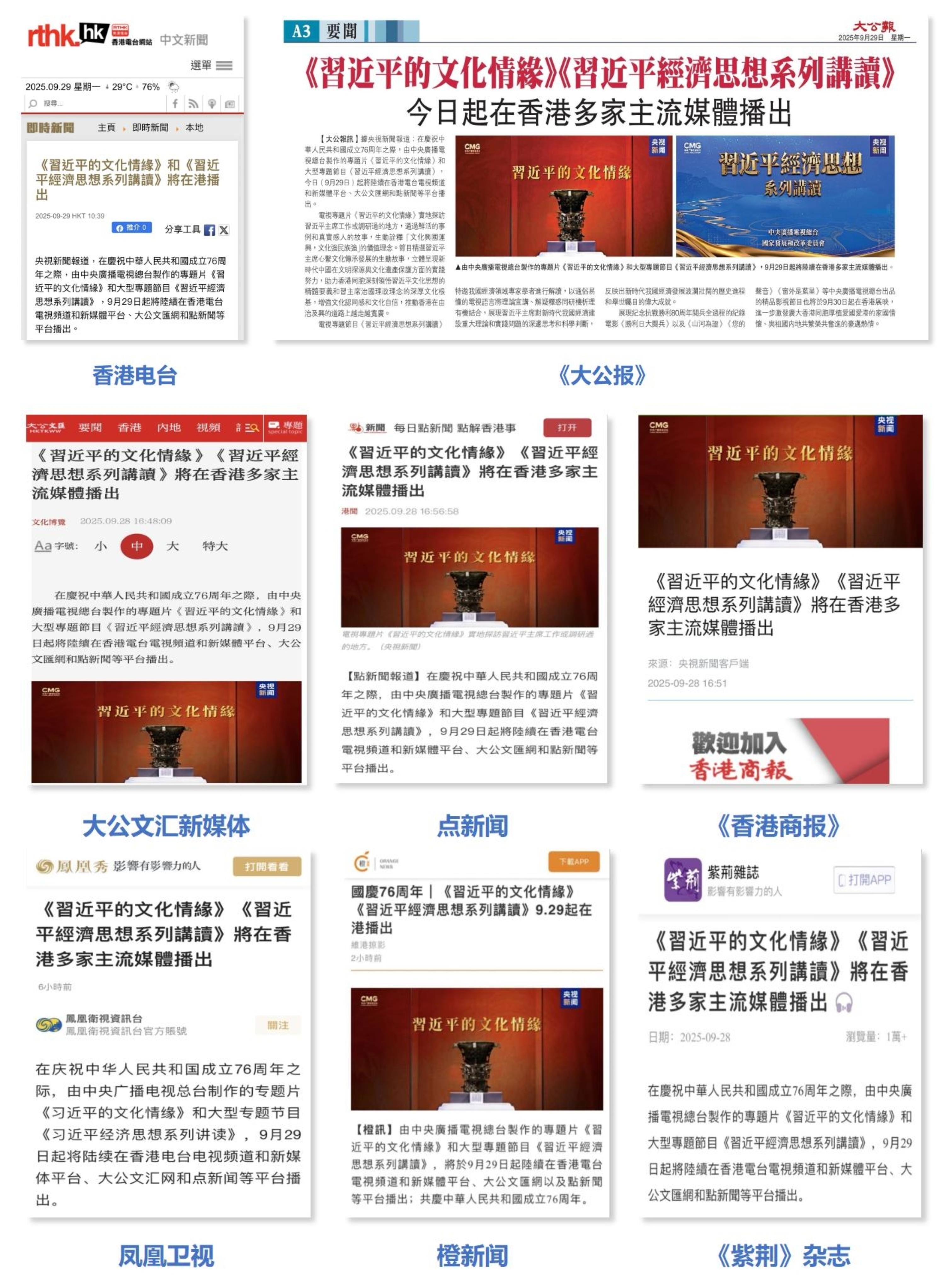 9月29日起,電視專題片《習近平的文化情緣》將在香港電台電視頻道和新媒體平台、大公文匯網和點新聞等平台上線播出。大型專題節目《習近平經濟思想系列講讀》也將於10月17日起在香港電台電視頻道和新媒體平台播出。