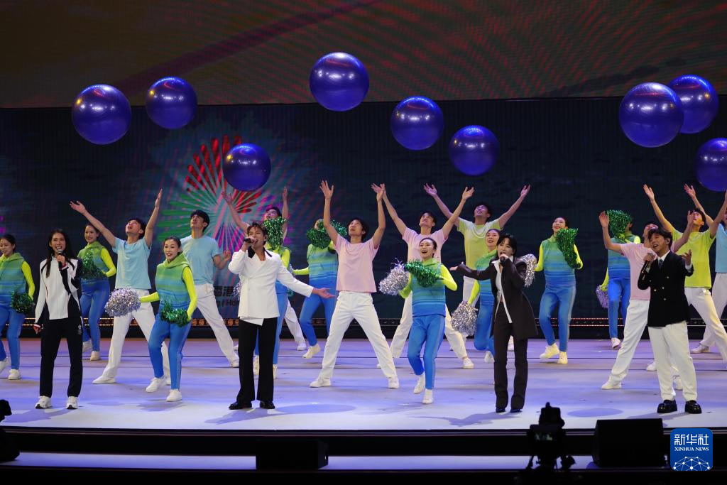 10月2日,眾星在「紫荊花開 香滿神州」國慶文藝晚會上演唱《我攜山海等你來》。新華社發(王申攝)