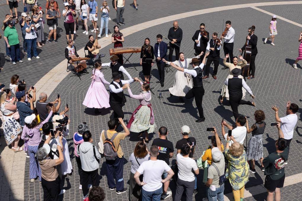 6月14日,為慶祝首個文明對話國際日,「對話·知音」文明對話國際日主題活動在匈牙利首都布達佩斯舉行。圖為中匈藝術家在城市快閃音樂活動上表演。新華社發(弗爾季·奧蒂洛攝)