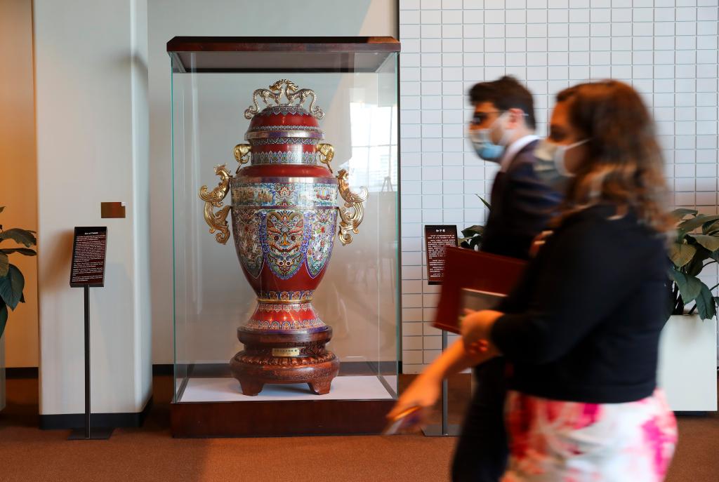 這是2021年10月21日在紐約聯合國總部拍攝的中國政府贈送的「和平尊」。新華社記者 王迎 攝