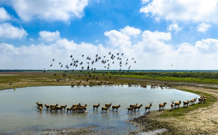 2025年10月11日,在江蘇東台條子泥濕地,候鳥飛翔,成群野生麋鹿悠閒散步,一派人與自然和諧共生的生態美景(無人機照片)。新華社發(孫家錄攝)