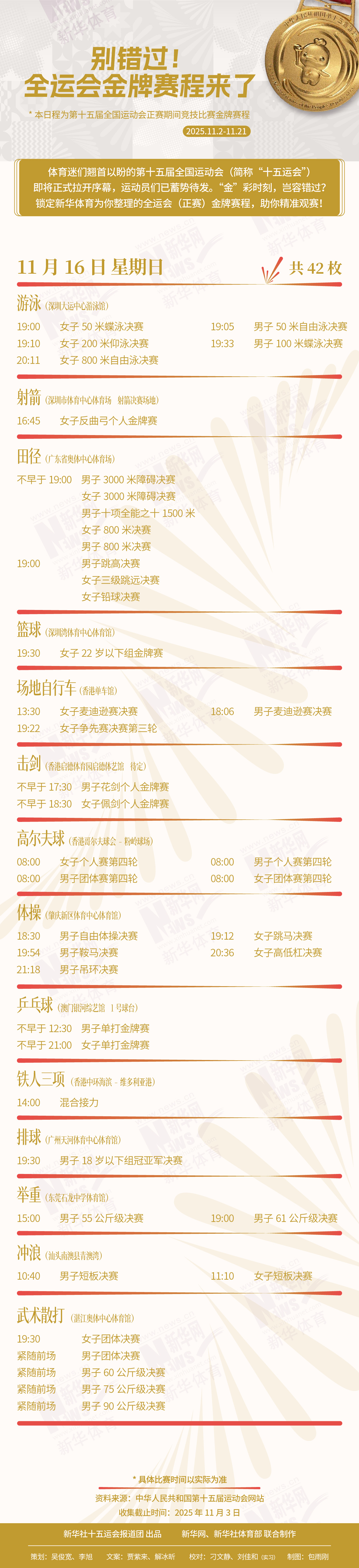 體育迷們翹首以盼的第十五屆全國運動會(簡稱「十五運會」)即將正式拉開序幕,運動員們已蓄勢待發。「金」彩時刻,豈容錯過?鎖定新華體育為你整理的全運會(正賽)金牌賽程,助你精準觀賽!