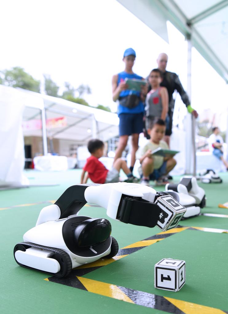 2024年7月1日,兒童在AI+智慧時代展區操控機器人。2024年6月29日至7月2日,香港維多利亞公園舉行以「萬千氣象看中華」為主題的「維園慶回歸」活動,科技賦能是此次活動主題之一。新華社記者 陳鐸 攝