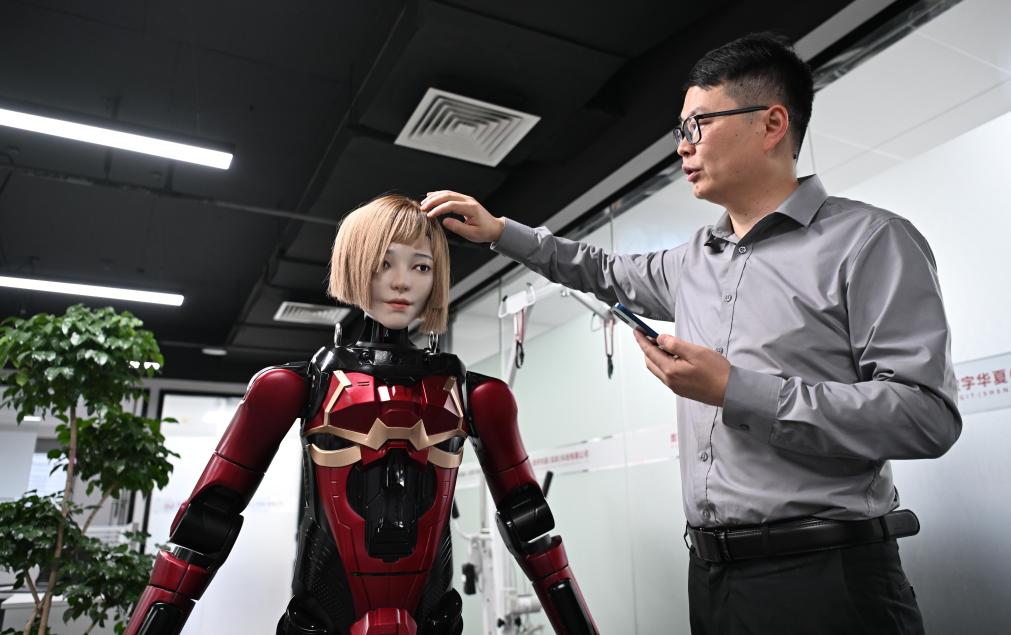 在數字華夏(深圳)科技有限公司,工作人員展示人形機器人夏瀾(2025年3月27日攝)。新華社記者 鄧華 攝
