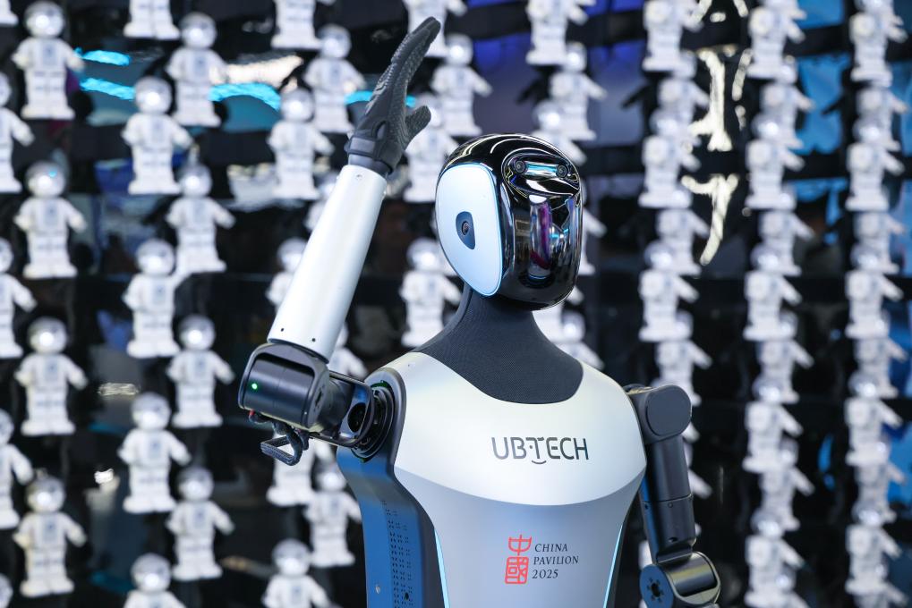2025年4月23日,在深圳優必選科技展廳內,商用版人形機器人Walker C向觀眾揮手致意。新華社記者 梁旭 攝