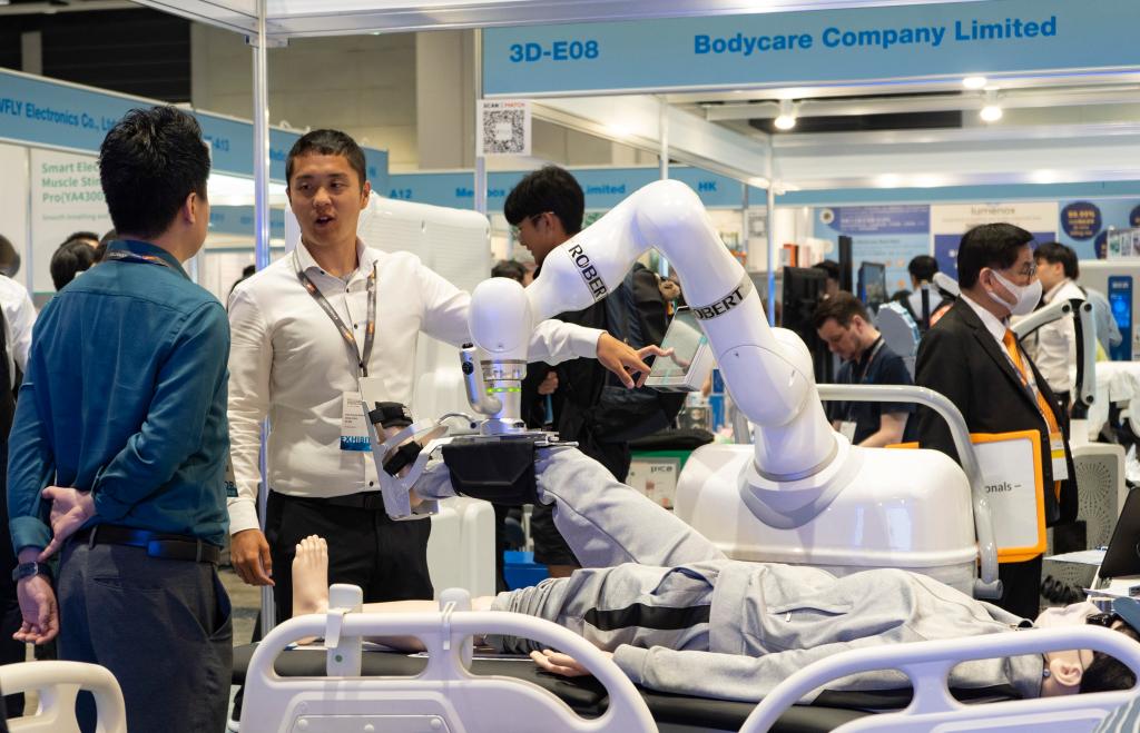 2024年5月17日,在第十五屆「香港國際醫療及保健展」上,展商向參觀者介紹科技醫療産品。新華社記者 龍鏡伊 攝