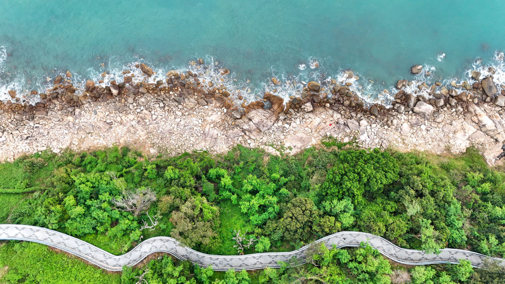 ↑2025年10月29日,黃蘊瑤在深圳鹽田海邊騎行(無人機照片)。新華社記者 梁旭 攝