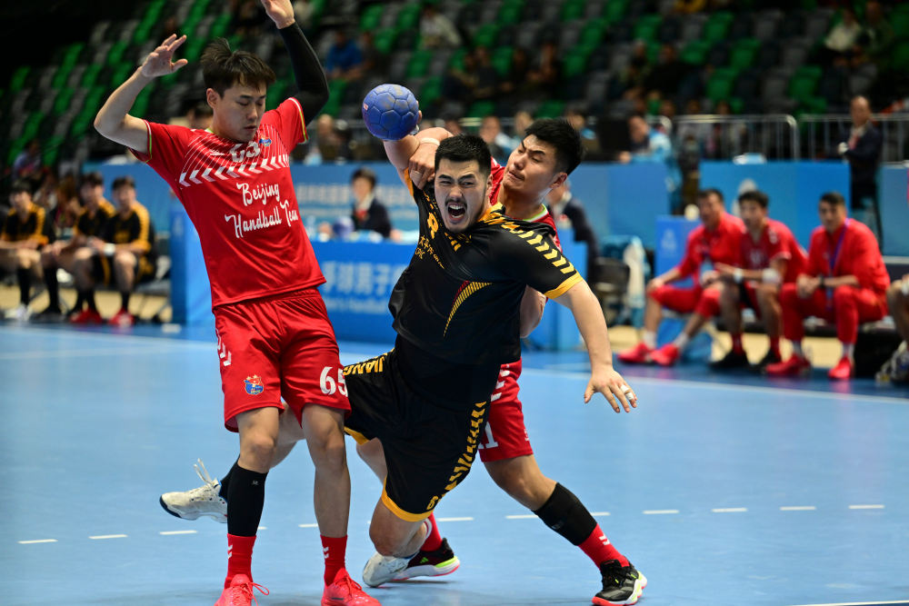↑2025年11月8日,江蘇隊球員謝慶龍(中)在比賽中進攻。當日,在香港進行的第十五屆全國運動會男子手球半決賽中,江蘇隊23比22戰勝北京隊。新華社記者 於洋 攝