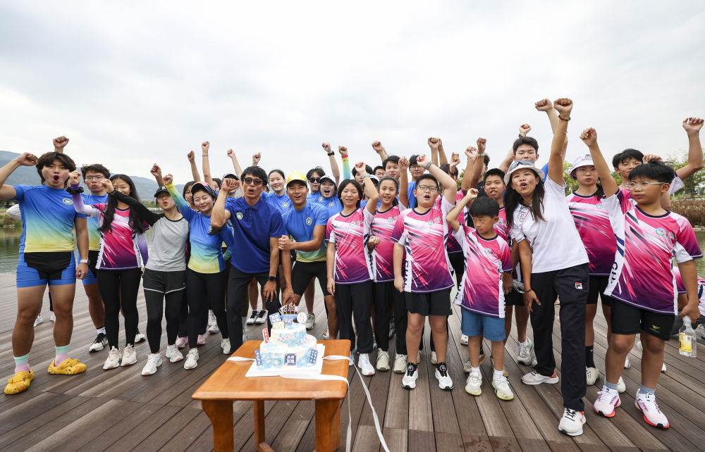 ↑2025年11月1日,賽艇隊成員在訓練後為教練朱銘琨和學員趙煜陽慶祝生日。新華社記者 胡星宇 攝