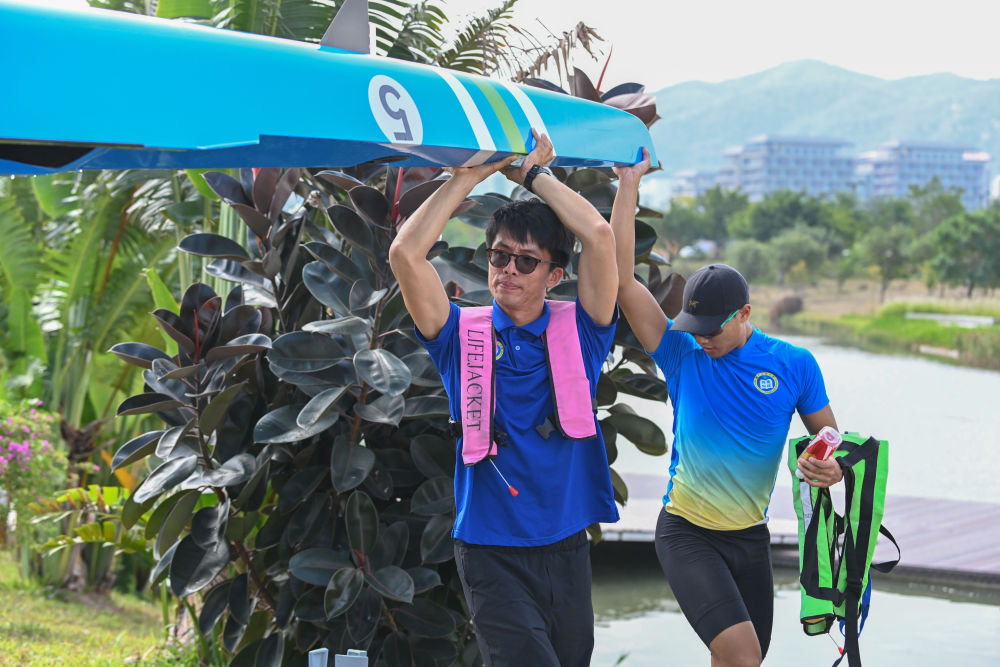 ↑2025年11月1日,教練朱銘琨(左)在訓練後幫助學員收納賽艇。新華社記者 肖恩楠 攝