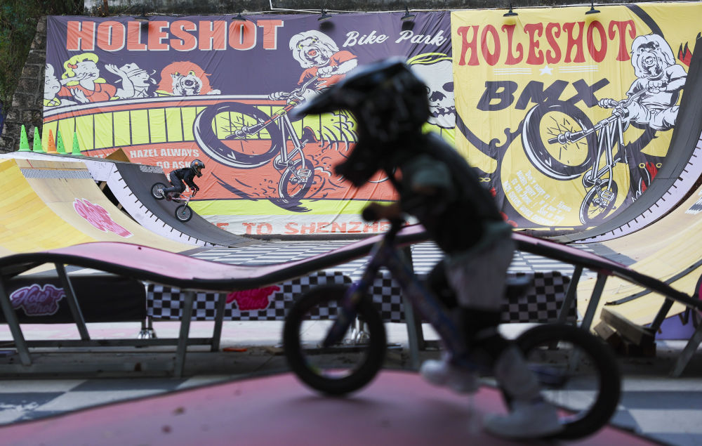 ↑2025年10月31日,在位於深圳福田區的HOLE SHOT騎行公園,小朋友們練習小輪車。新華社記者 胡星宇 攝
