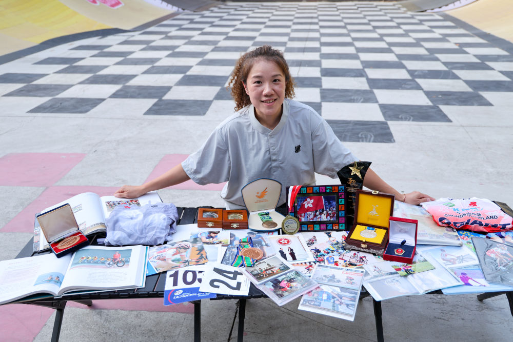 ↑2025年10月31日,在位於深圳福田區的HOLE SHOT騎行公園,黃蘊瑤展示運動員時期的獎牌和照片。新華社記者 梁旭 攝